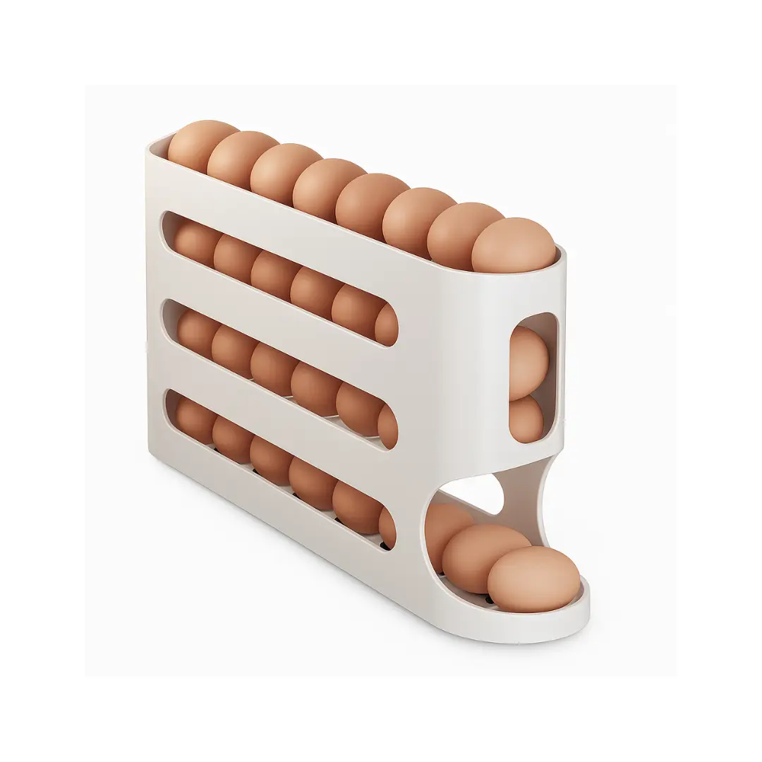 El Dispensador de Huevos de 4 Niveles con Rodamiento Automático es la solución perfecta para mantener tu heladera organizada y aprovechar al máximo el espacio disponible. Gracias a su estructura inclinada por gravedad, los huevos ruedan suavemente hacia adelante, garantizando que siempre tengas el próximo al alcance sin necesidad de buscarlos ni correr el riesgo de que se caigan.